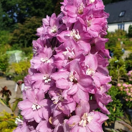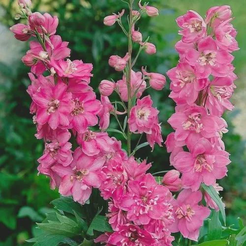 Высокий и стройный, дельфиниум Астолат достигает 140–160 см, при этом сохраняет компактную ширину куста до 60–70 см. Стебли прямостоячие, прочные, увенчаны длинными кистями соцветий, плотно усыпанных крупными махровыми цветками диаметром 5–7 см. Их цвет — благородный розово-сиреневый, с переливами лавандового и приглушённым кремовым центром — словно сходит с полотен акварелистов.